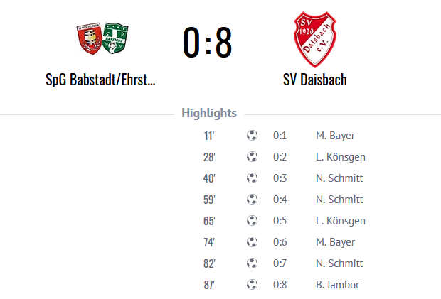 In der 70. Minute kam Sandro Bohland für Nicola Schmitt ins Spiel. Nur wenig später markierte Marvin Bayer nach Vorarbeit von Nils Schmitt seinen zweiten Treffer des Tages zum 6:0. Nils Schmitt selbst traf anschließend nach einem Traumpass von Lars Könsgen zum 7:0, ehe Benjamin Jambor nach einer präzisen Freistoßflanke von Nicolas Maurer den Schlusspunkt zum 8:0 setzte.